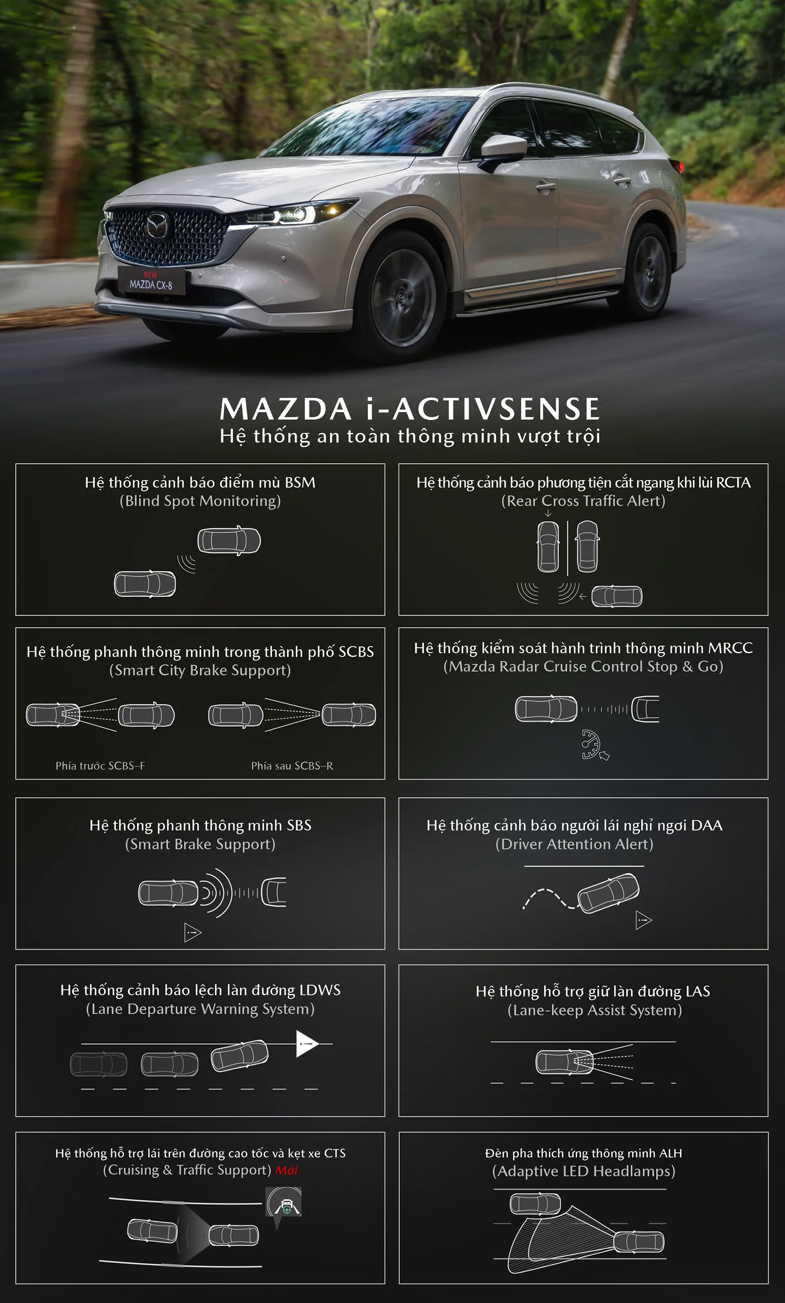 Với thông điệp “Chúng tôi không làm ra những chiếc xe mà chúng tôi tạo ra niềm vui và hạnh phúc cho người sử dụng”; do đó trong suốt quá trình phát triển, mục tiêu quan trọng nhất Mazda hướng đến đó chính là an toàn. Bên cạnh các công nghệ an toàn tiêu chuẩn như 6 túi khí, hỗ trợ phanh ABS/ EBD/BA, cân bằng điện tử DSC, kiểm soát lực kéo TCS, khởi hành ngang dốc HLA, camera 360o và cảm biến áp suất lốp TPMS mới; New Mazda CX-8 được trang bị gói an toàn thông minh cao cấp i-Activsense với các tính năng: cảnh báo điểm mù BSM, cảnh báo phương tiện cắt ngang khi lùi RCTA, cảnh báo lệch làn đường LDWS, hỗ trợ giữ làn đường LAS, cảnh báo người lái nghỉ ngơi DAA; hỗ trợ phanh thông minh SBS; hỗ trợ phanh thông minh trong thành phố SCBS-F, đèn trước thích ứng thông minh ALH, hỗ trợ phanh thông minh khi lùi SCBS-R. Đặc biệt trên New Mazda CX-8 gói an toàn i-Activsense được bổ sung thêm các tính năng hỗ trợ lái thông minh hàng đầu phân khúc như: